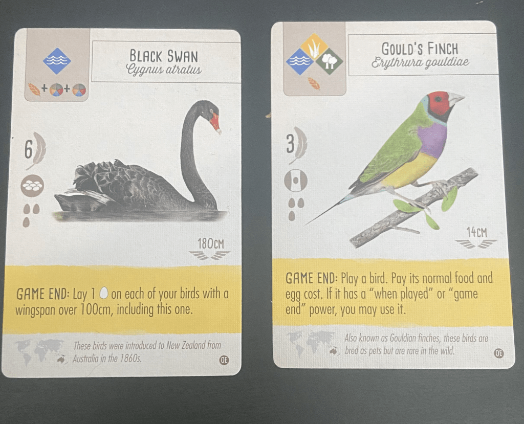 Let’s first talk about the new bird power, as it’s the least impactful of the new changes. Oceania introduces “Game End” bird powers which give you a fairly powerful boost as long as you’ve set yourself up to be able to take advantage of it. I’ve seen some folks on the internet say these birds can be overpowered, but I disagree. You really do need to plan to use these powers to their full effect if you want a lot of mileage out of them. Whereas the Round End cards of the European Expansion offer moderate bonuses for moderate requirements, these ones either require you to put in some preparation to take advantage of the card to its fullest extent. For example, if we refer to the “Black Swan” above, you would potentially be able to lay up to a dozen eggs if you had a lot of larger birds. But if you have a board full of tiny birds? It’s not going to be terribly useful.